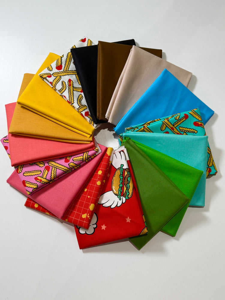 Burger Night is a kit for a fun and funky Rockstar (or someone you love) who loves burgers, fries, and bold colors. The quilt pattern incorporates string piecing (perfect for scrap busting), cutting with a template, and sewing partial seams– all wonderful skill builders!