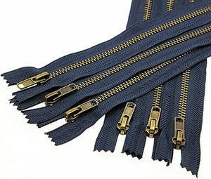 #3 size,close end antique brass plated metal zippers for jackets, sewing, bags, crafts. Navy canvas tape.