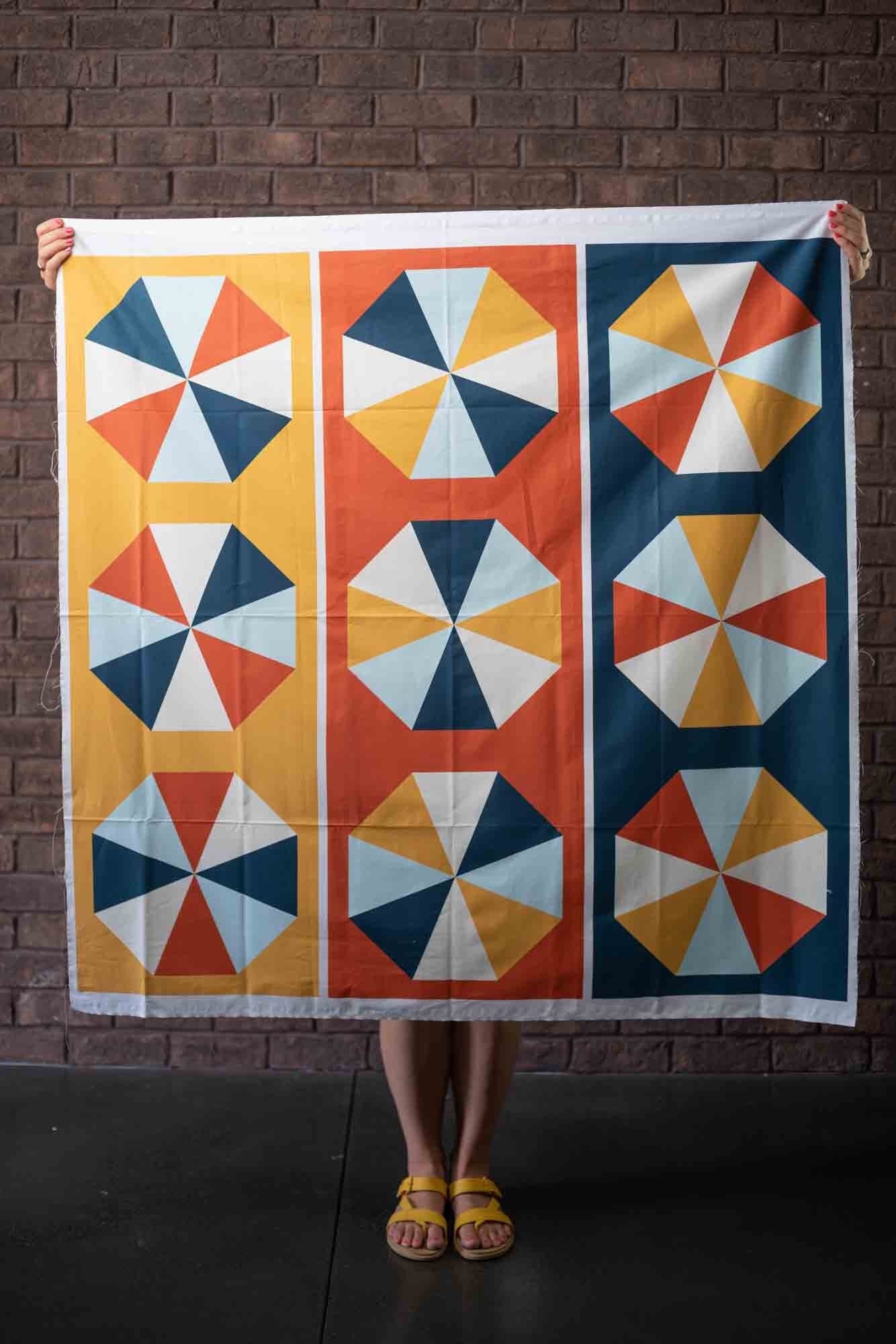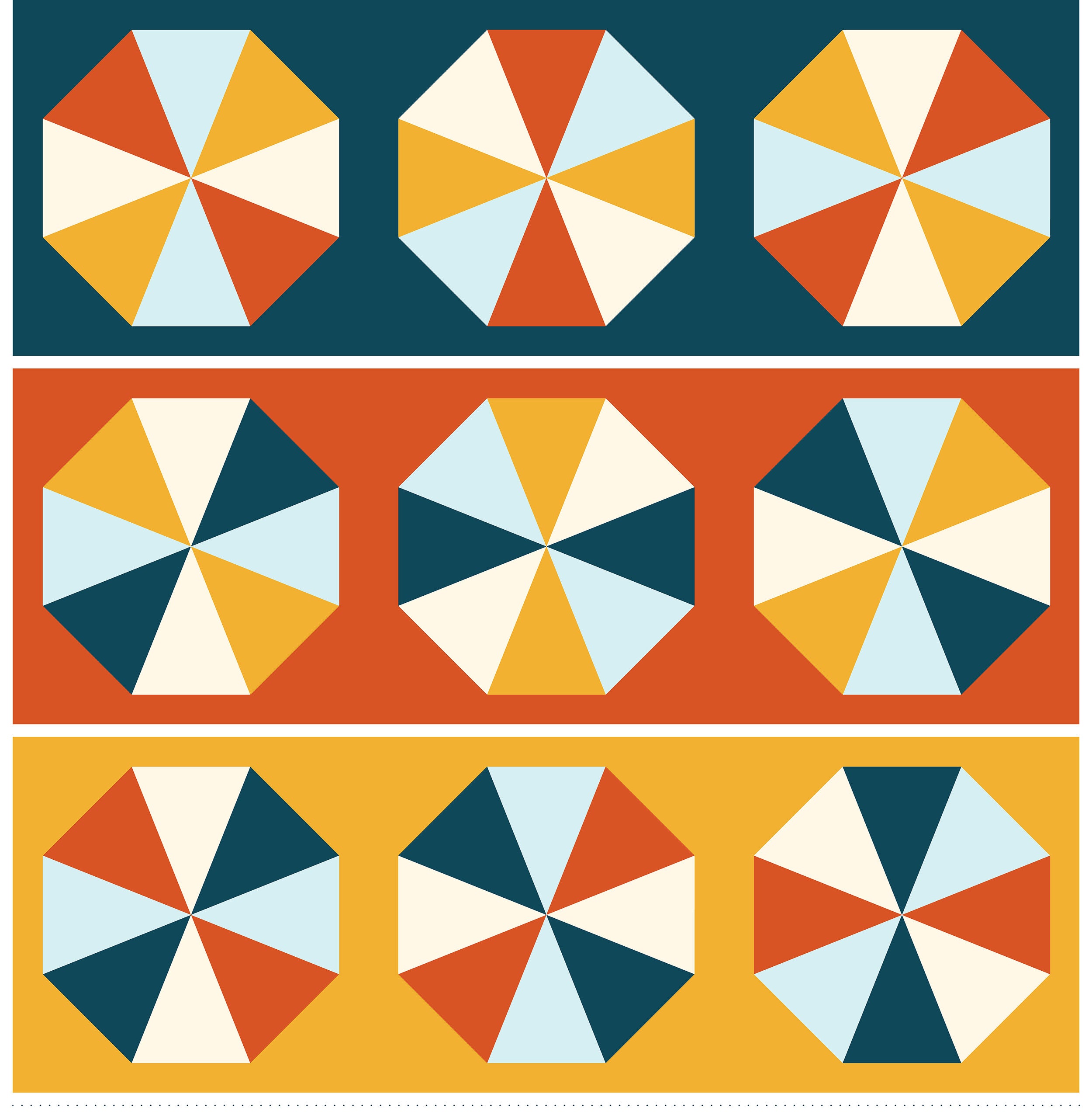 These Octagon Table Runners are hopelessly playful, whether you see umbrellas, beach balls, or pinwheels, they will bring movement and personality to your table. Quilt each row on its own, then cut apart and bind to make three table runners from one panel, or cut the “blocks” a part and rearrange them into a fun quilt top!