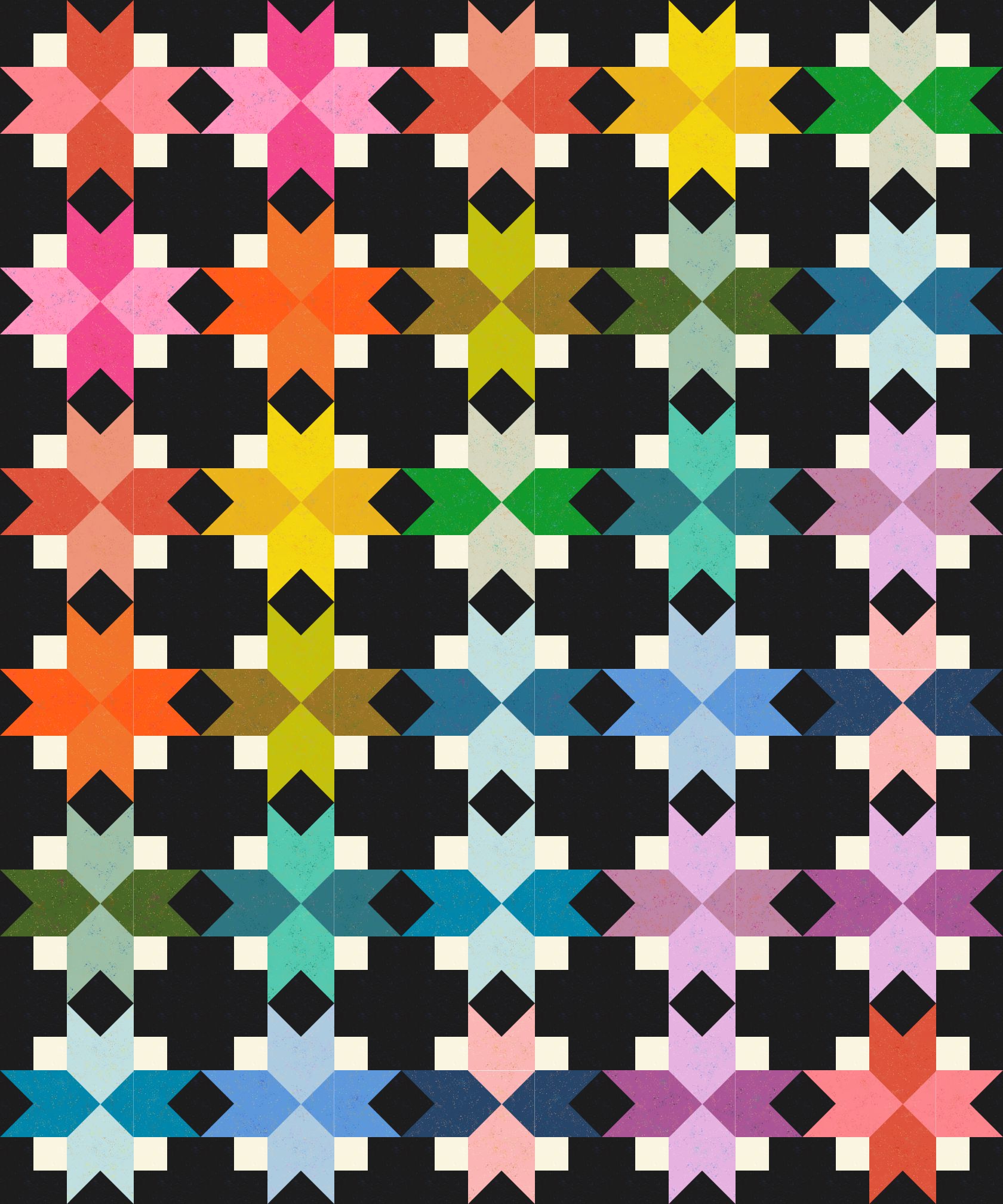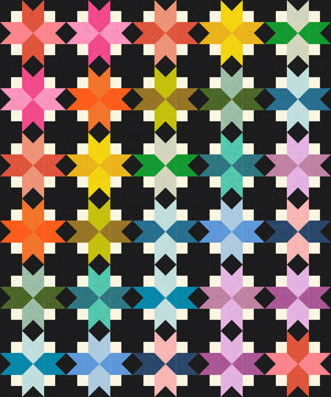 This Speckled Rainbow Quilt gives us a little taste of the full spectrum of visible light on a dark background. The kit includes all Ruby Star Society Speckles to make the THROW SIZED quilt top (approximately 60 x 72 inches). Pattern, backing, binding, and batting sold separately