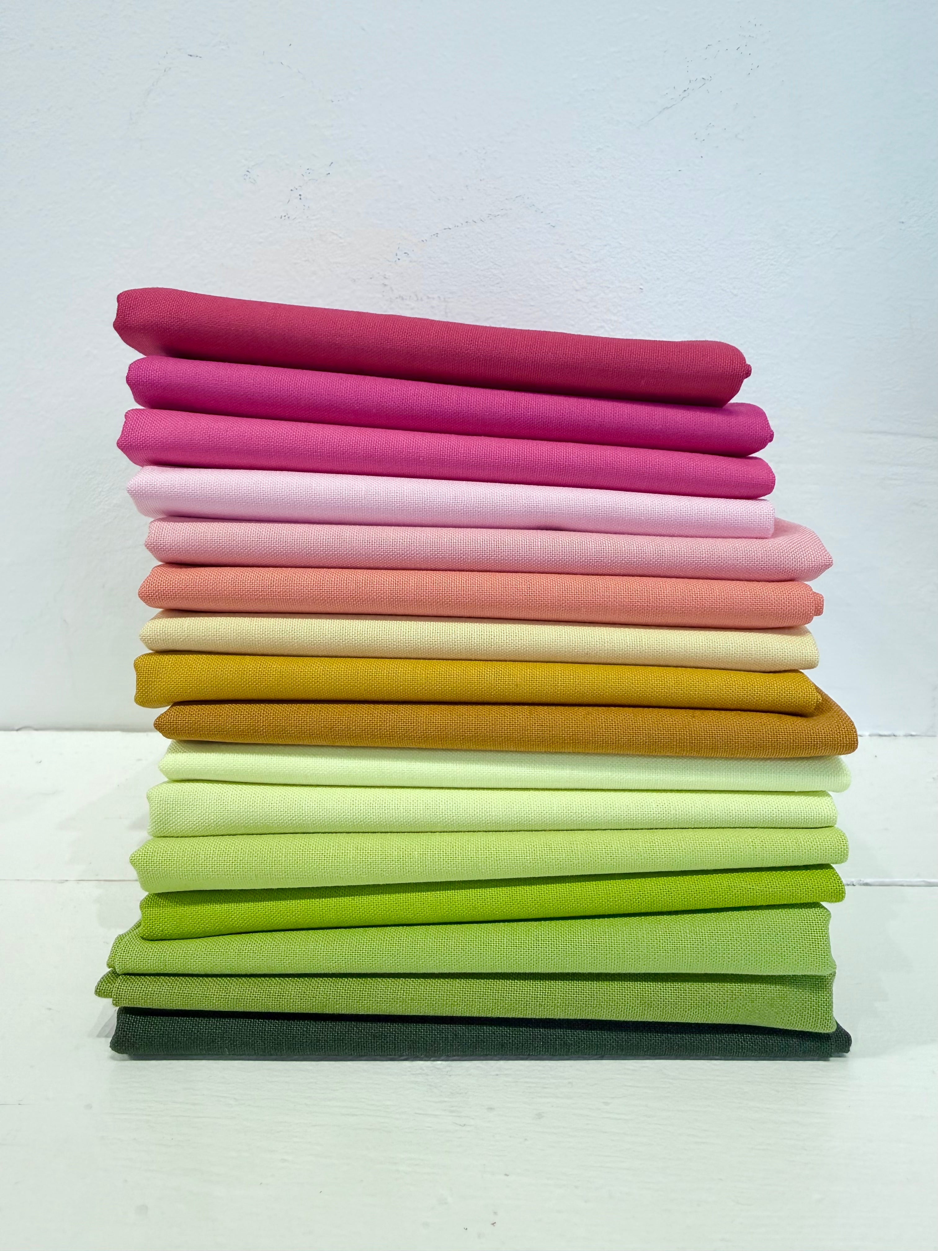 16 curated fat quarters (4 yards of fabric total) of PBS Painter’s Palette Solids in the bright pinks and greens of fresh watermelon radish.