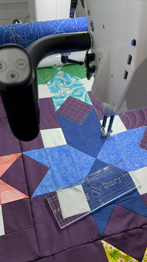 The Quilting Rockstar Straight Ruler is a basic straight edge ruler. It’s perfect for stitch in the ditch, grids, and other strong geometric shapes.
